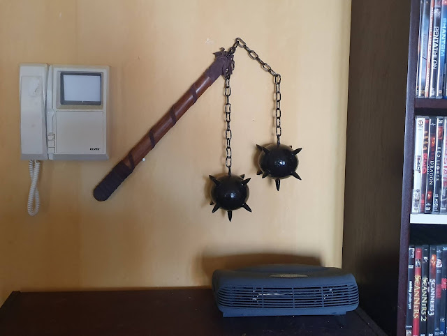 Fick min stridsklubba, morgonstjärna, stridsgissel eller vad en sån nu kallas… Testade att svinga den, den är totalt livsfarlig! Skulle man få bollarna i huvudet kan man hälsa hem!